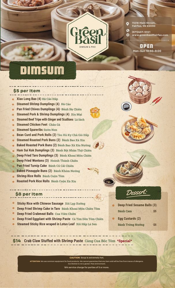 Welcome to Green Basil DimSum & Pho, a culinary gem located at 11216 Lee Hwy, Fairfax, VA. This inviting establishment highlights a delightful fusion of Vietnamese cuisine, specializing in Dim Sum and steaming bowls of Pho. The menu offers a variety of options catering to diverse palates, including delicious vegan dishes, making it an excellent choice for all diners.